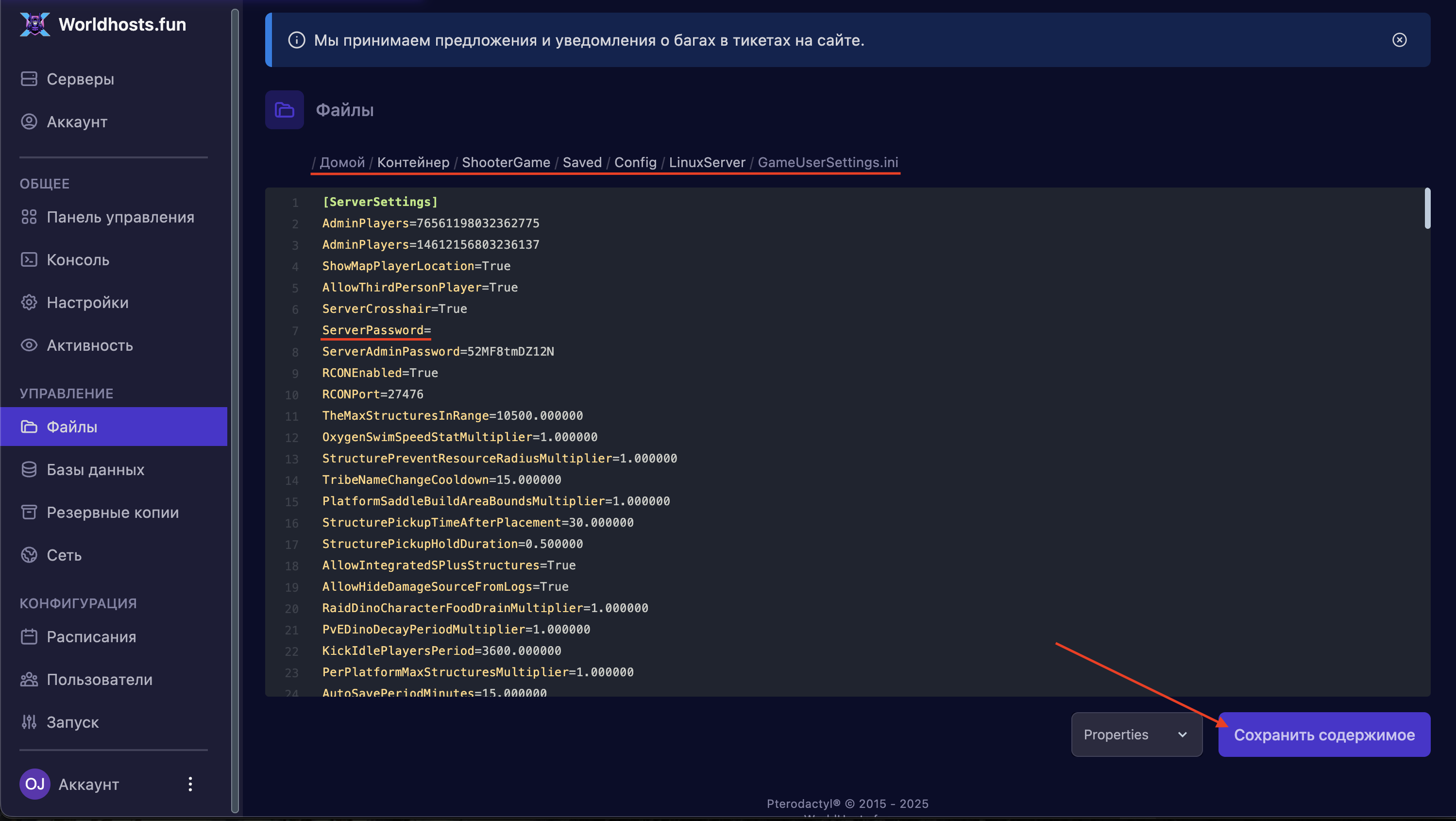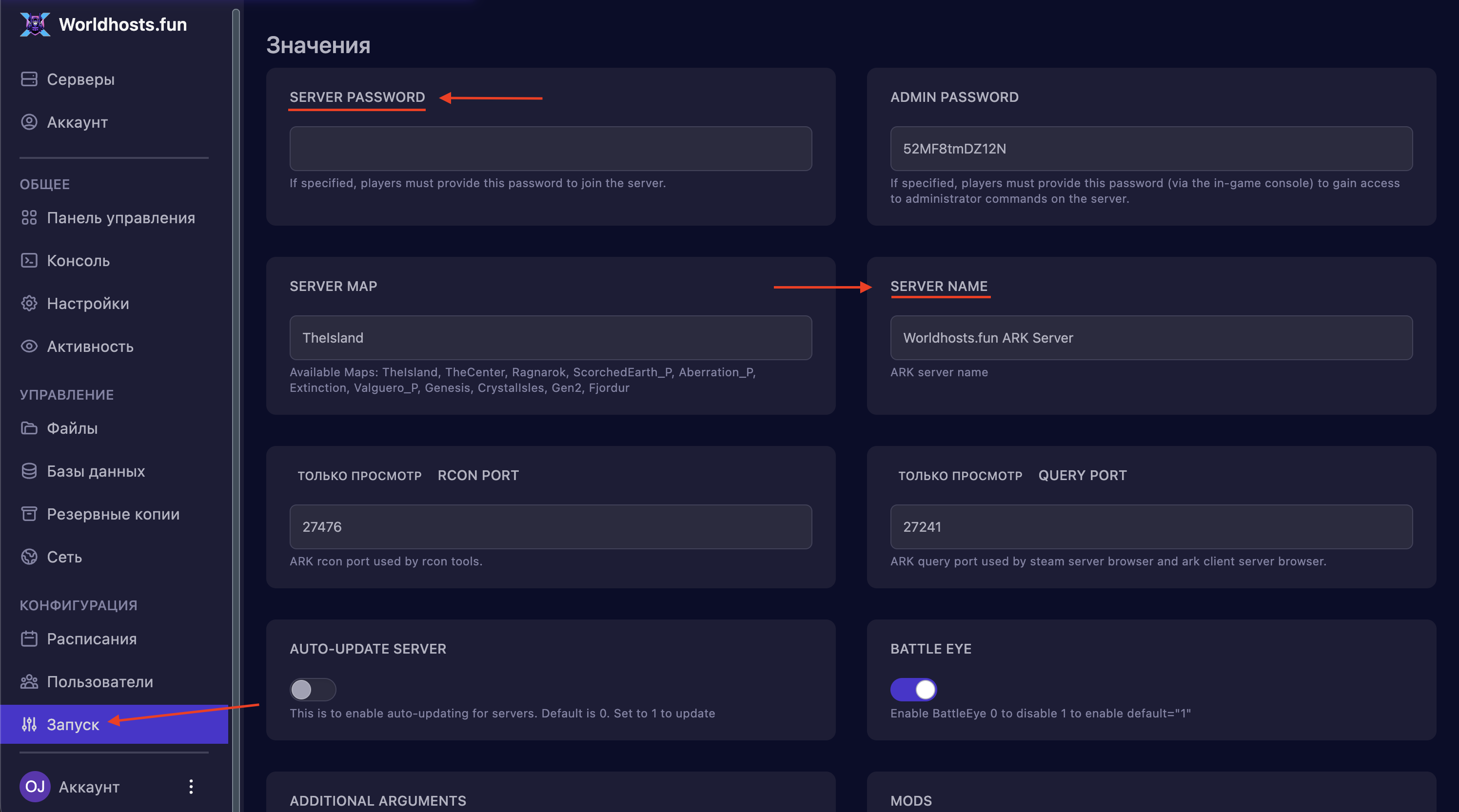 ☝️ Прекрасно! Изменение имени и пароля сервера ARK: Survival Evolved через панель управления WorldHosts.fun — это простой процесс, который не требует специальных технических знаний. Правильно настроенные параметры помогут вам создать успешный и популярный игровой проект с активным сообществом.