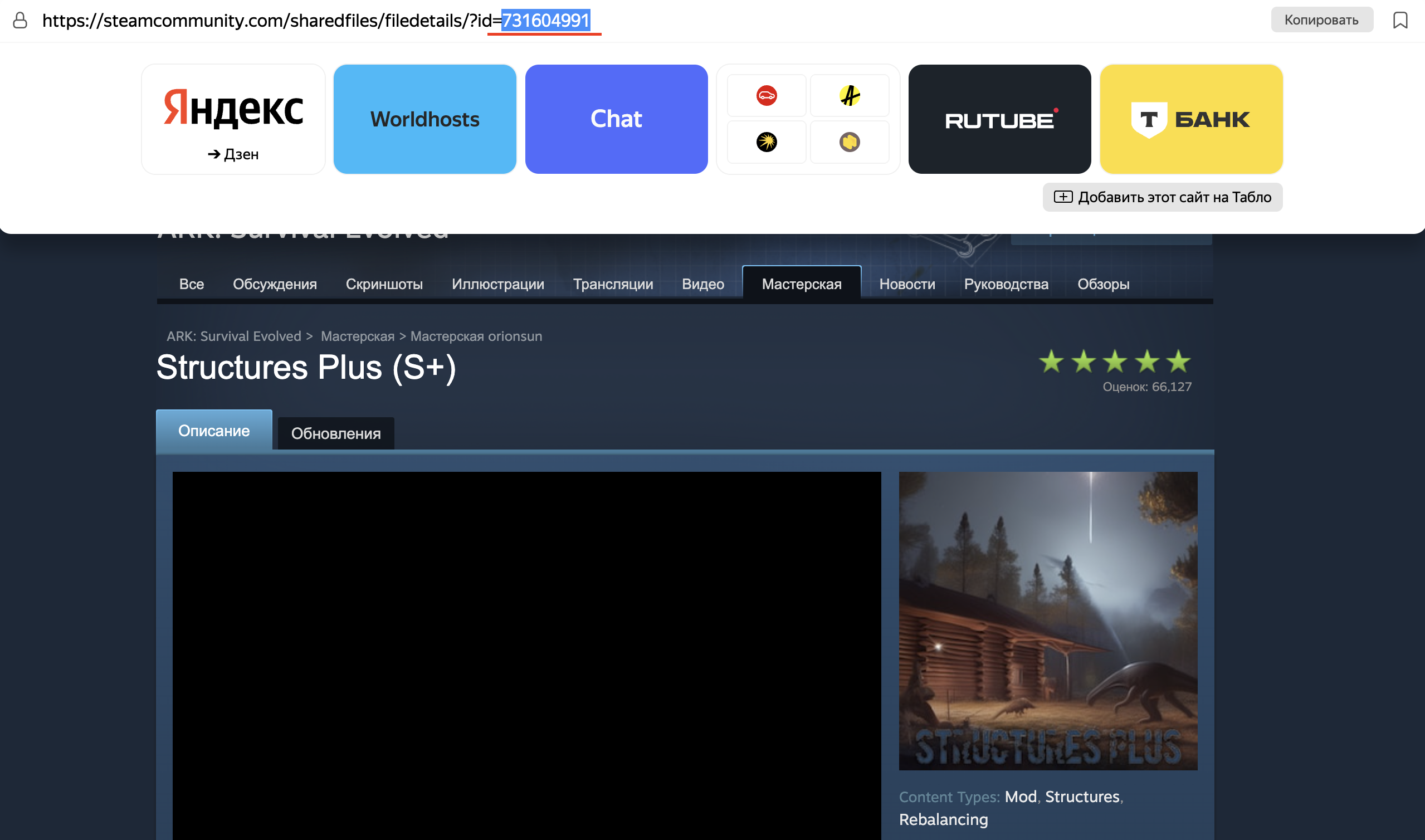 Шаг 1. Найдите нужный мод в Steam Workshop, разберем для примера мод Structures Plus (S+). Копируем его ID.