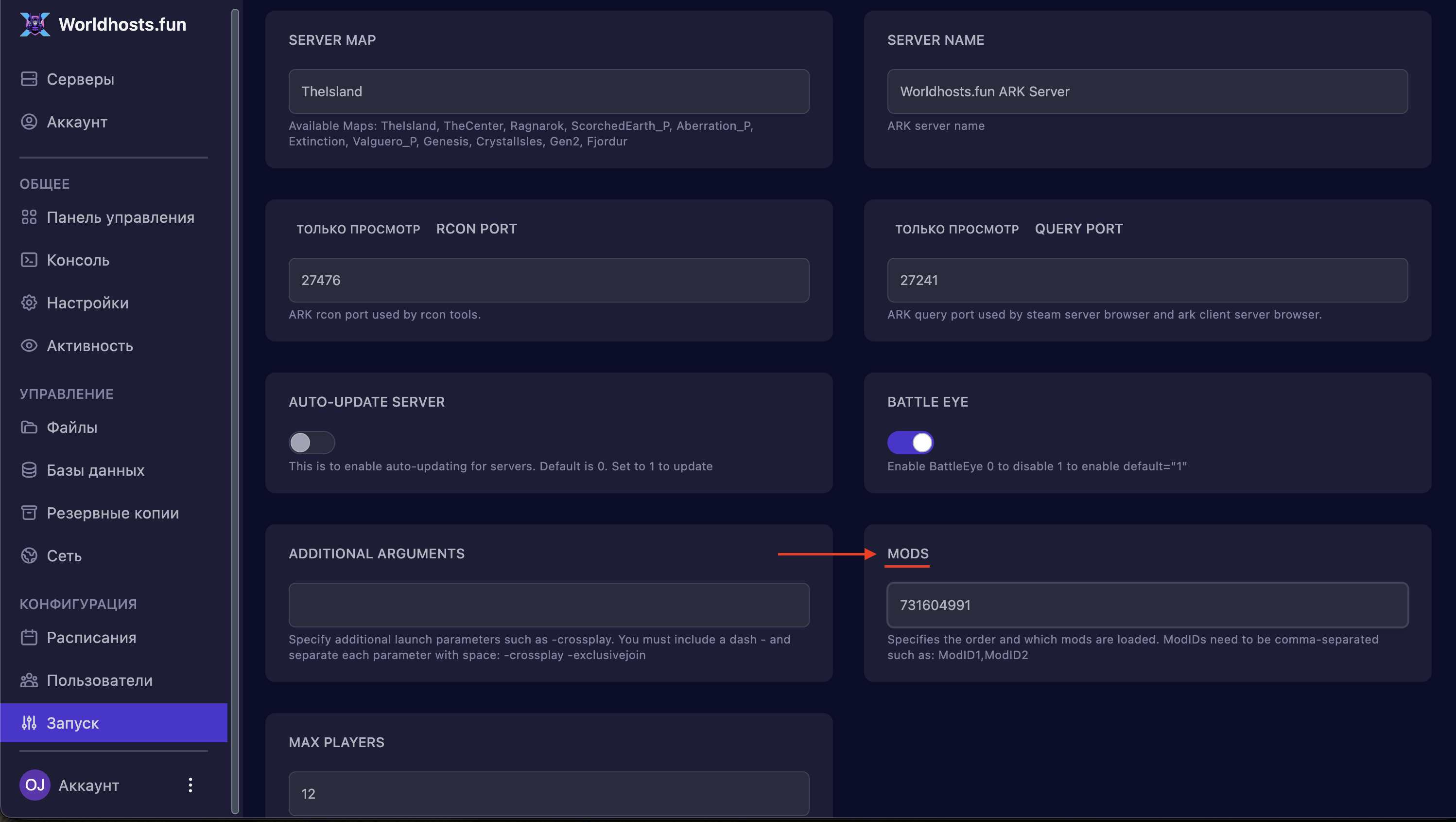 Шаг 3. Пролистайте ниже и найдите графу «Mods». Введите через запятую ID нужных модов. После крайнего ID ставить запятую или другие символы не нужно.