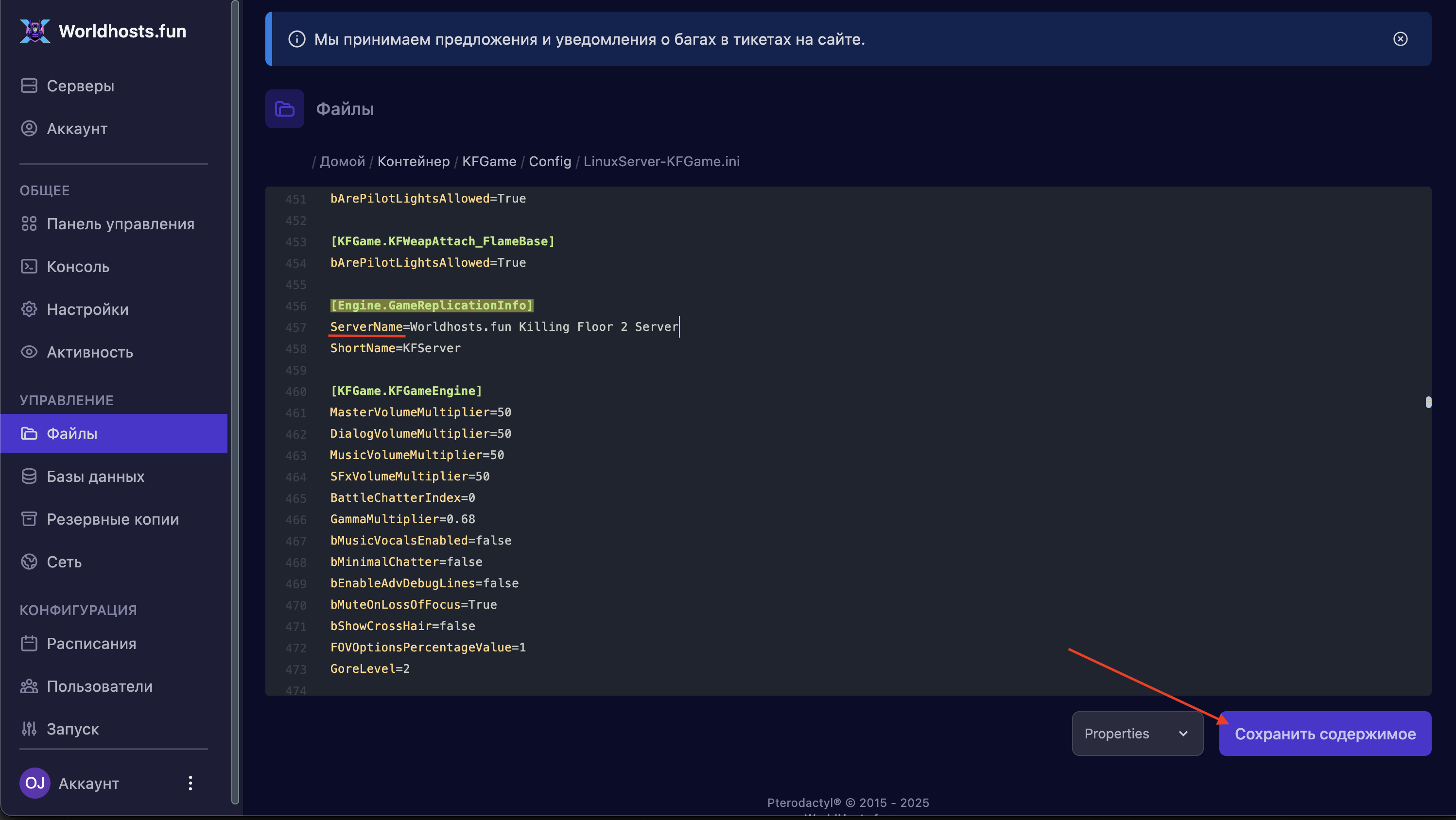 В боковом меню открываете «Файлы» и переходите в директорию /Домой/Контейнер/KFGame/Config/. Найдите файл LinuxServer-KFGame.ini. В секции [Engine.GameReplicationInfo] редактируем строку «ServerName=». Сохраняем содержимое.