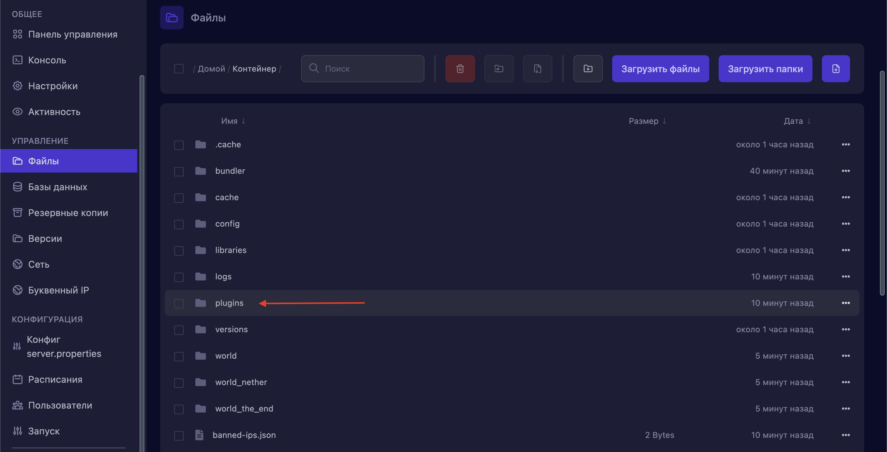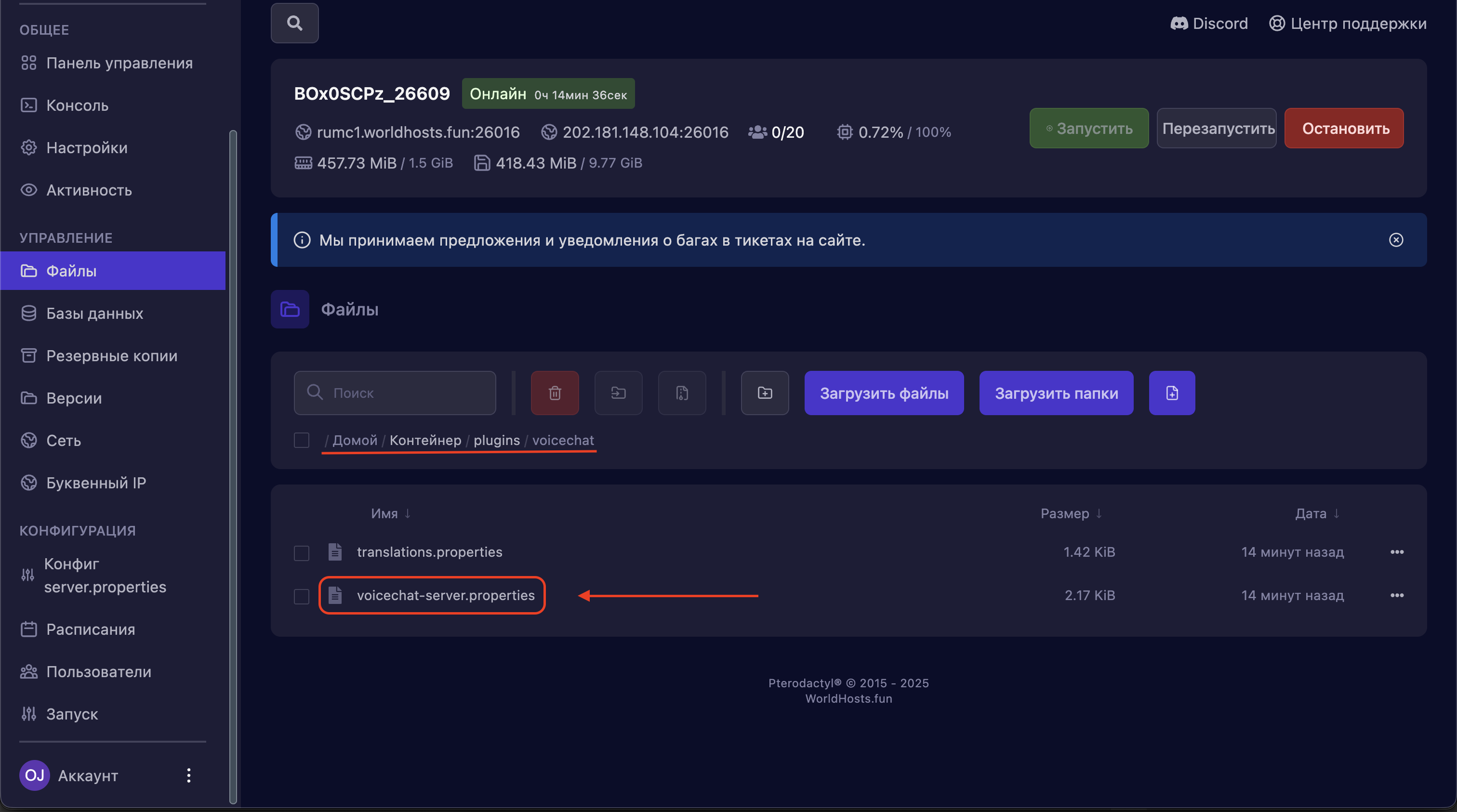 Шаг 2. Скаченный файл voicechat-bukkit-2.6.4.jar устанавливаете на сервер в папку plugins. Сделать это вы можете как через интерфейс панели управления (на странице "Файлы"), так и подключившись к SFTP серверу, инструкция ТУТ.