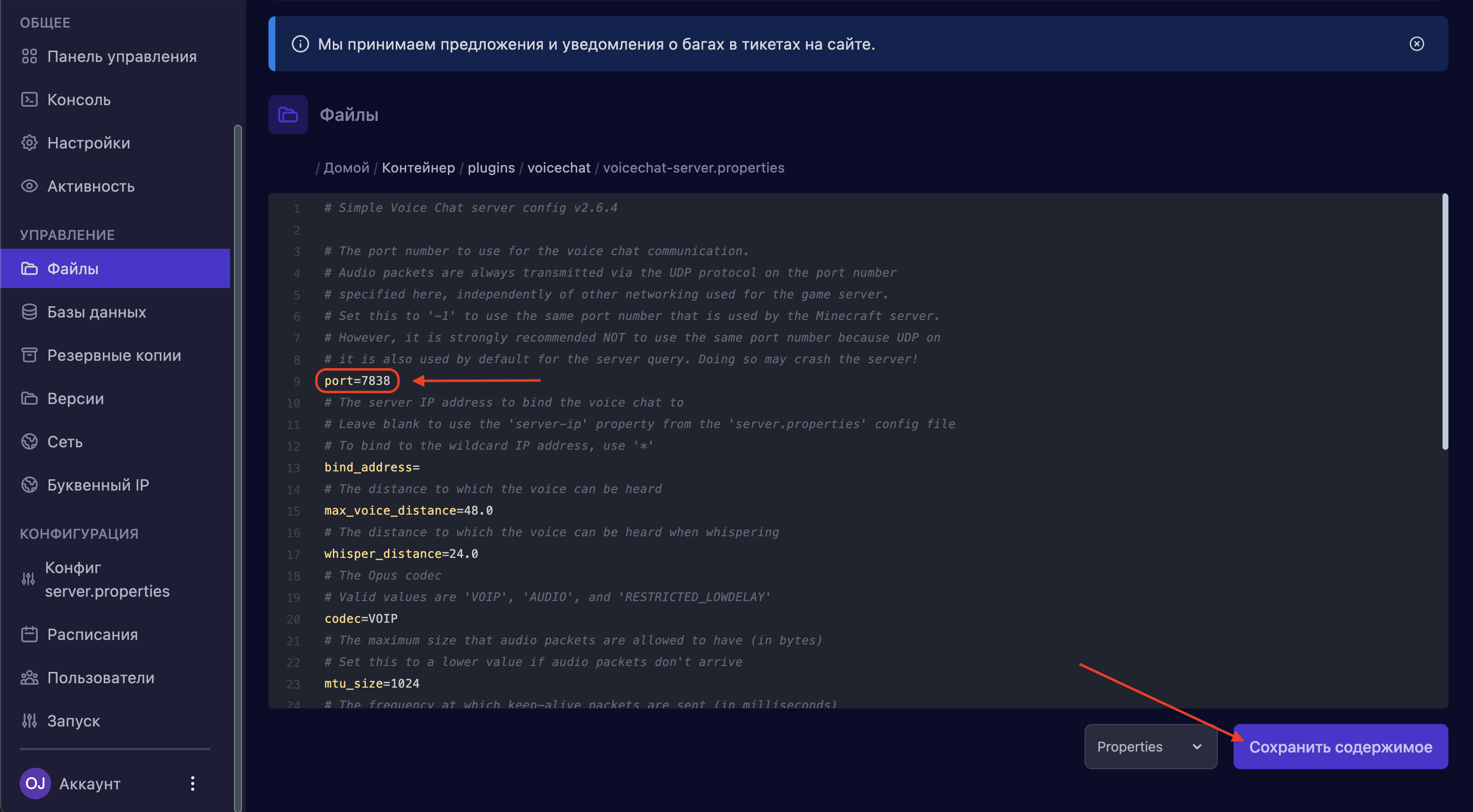 Шаг 5. Переходим в директорию /Домой/Контейнер/plugins/voicechat, открываем файл voicechat-server.properties и указываем созданный нами ранее порт.