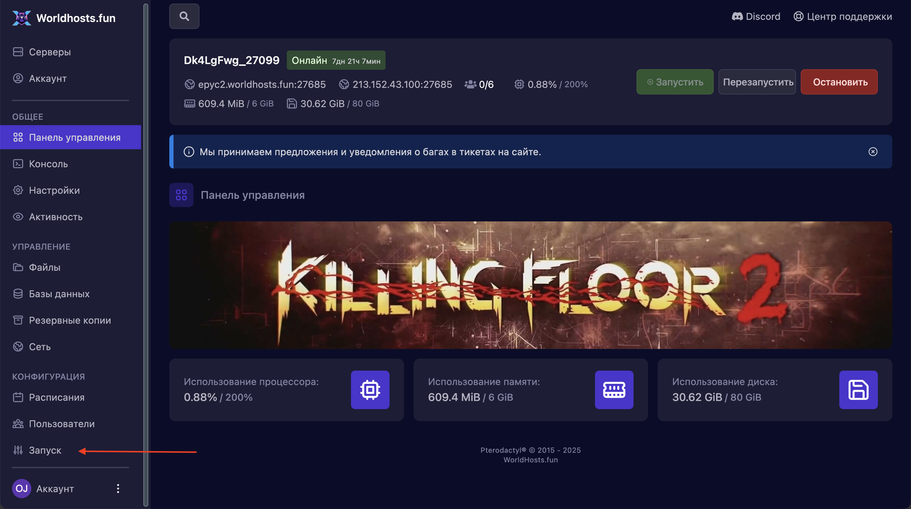 Шаг 1. Авторизируемся на хостинге, переходим в панель управления сервером KF2 и открываем страницу запуска.