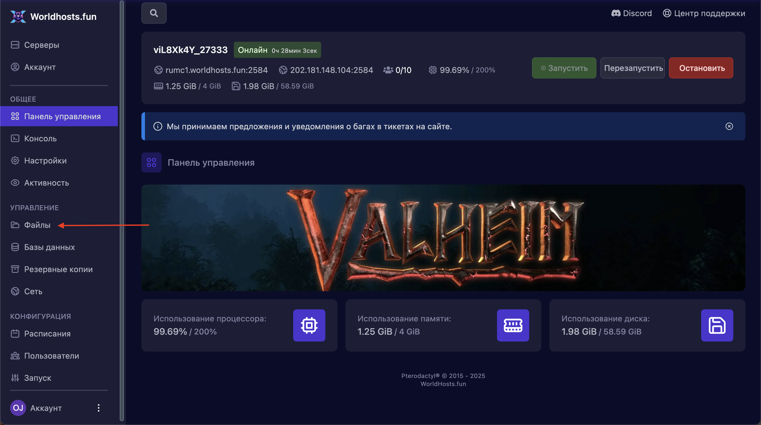 Шаг 1. Авторизируемся на хостинге и переходим в панель управления сервером Valheim.
