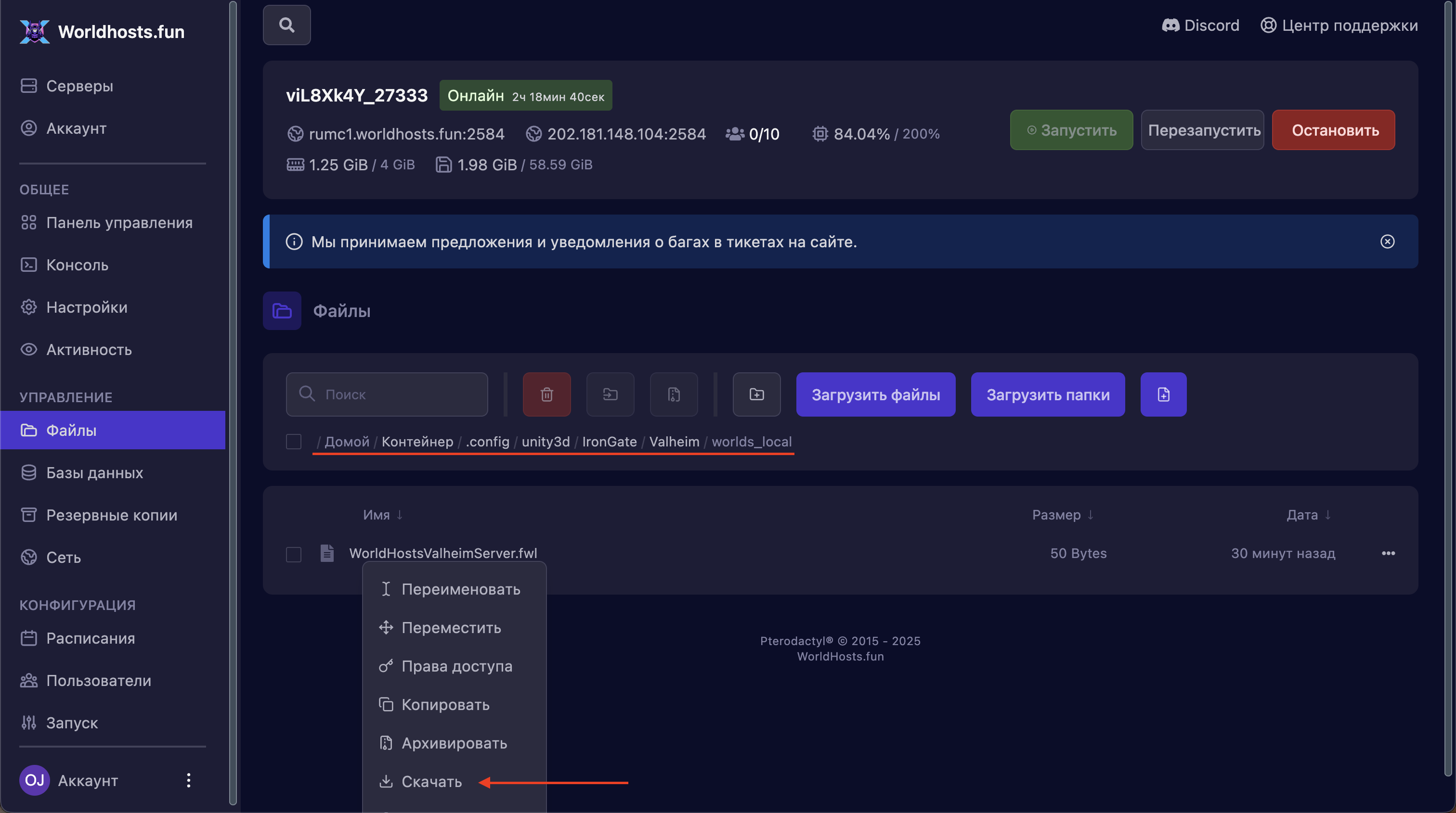 Шаг 2. Переходим в директорию /Домой/Контейнер/.config/unity3d/IronGate/Valheim/worlds_local и скачиваем файл .fwl