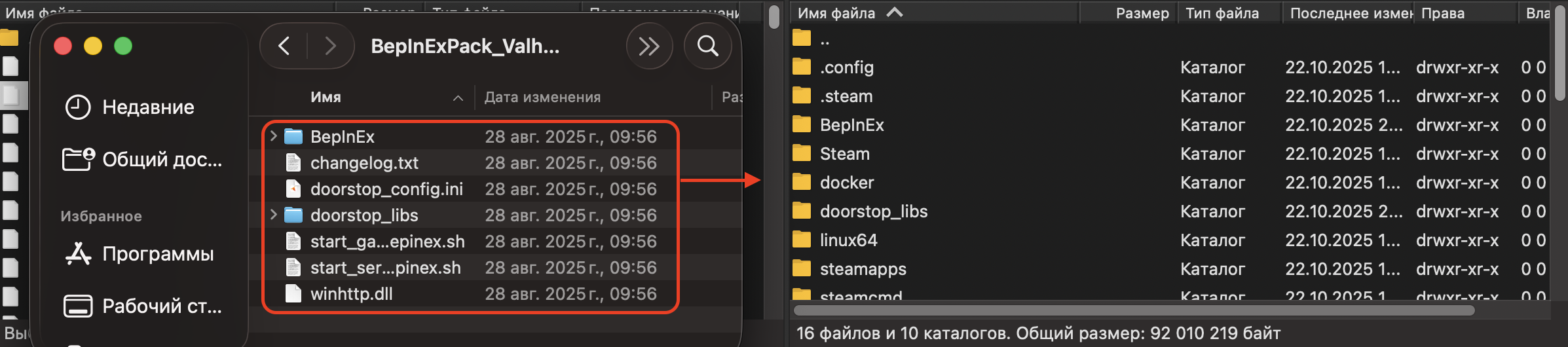 Шаг 2. Подключитесь к SFTP серверу, как это сделать описано ТУТ. Устанавливаем содержимое папки BepInExPack_Valheim в корневую папку сервера.