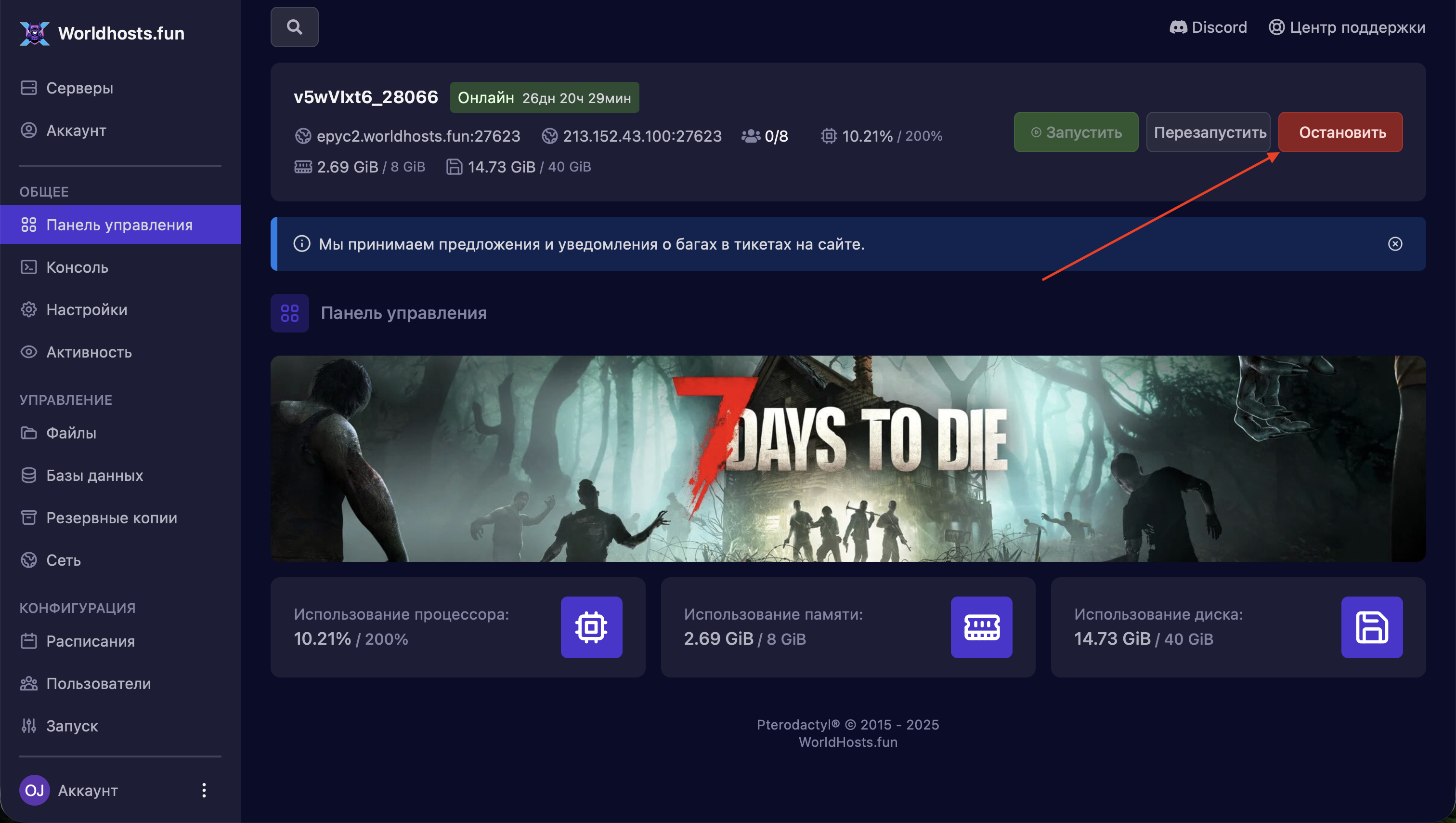 Шаг 1. Авторизируйтесь на хостинге, перейдите в панель управления и остановите работу сервера.
