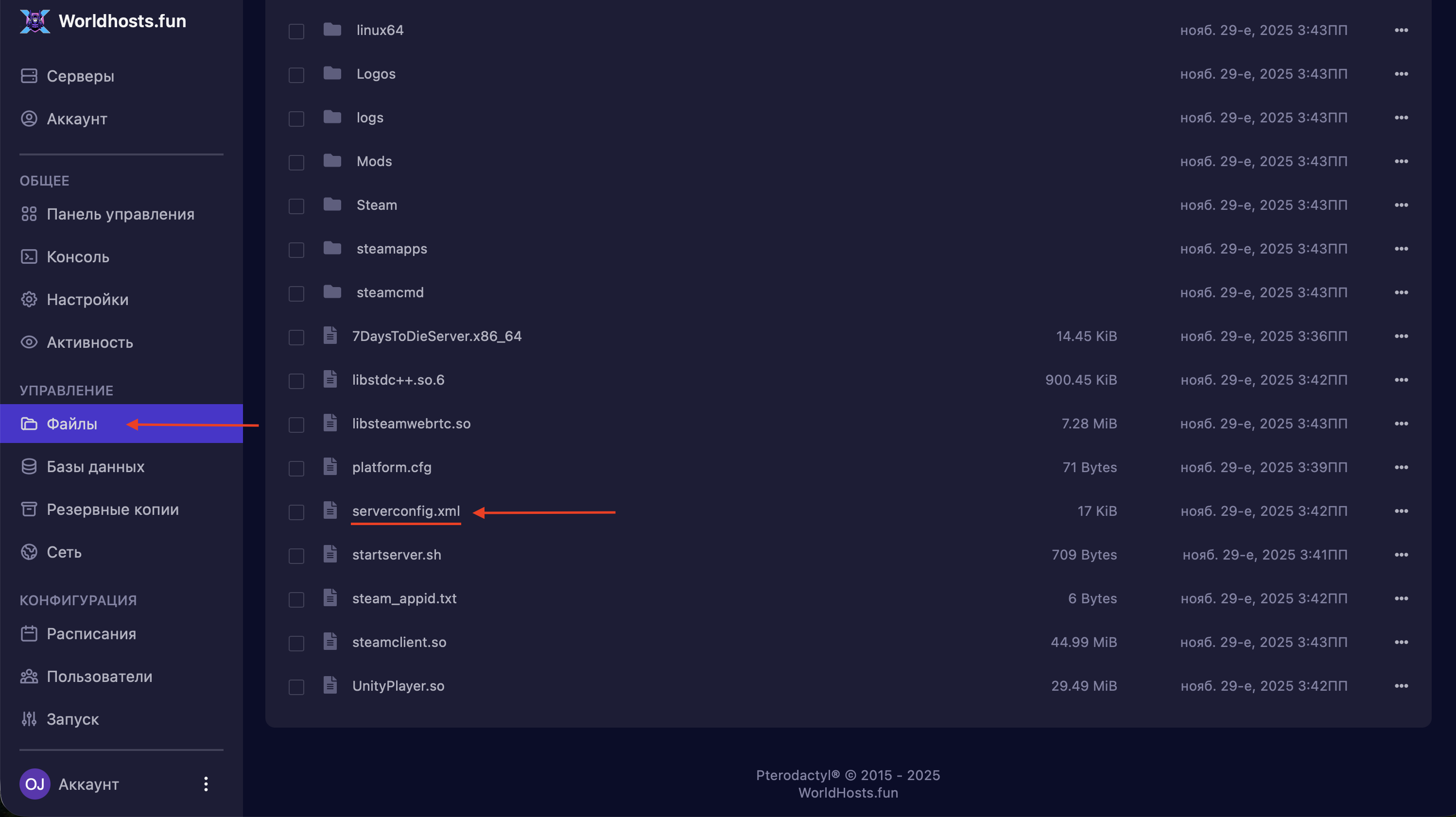 Шаг 2. В боковом пеню выбираем раздел «Файлы», в корневой папке сервера открываем конфирурационный файл serverconfig.xml.