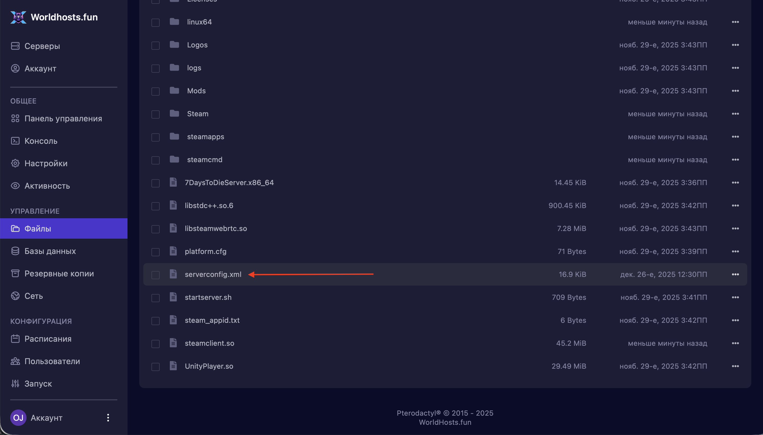 Шаг 2. Переходим в раздел «Файлы» и открываем serverconfig.xml.