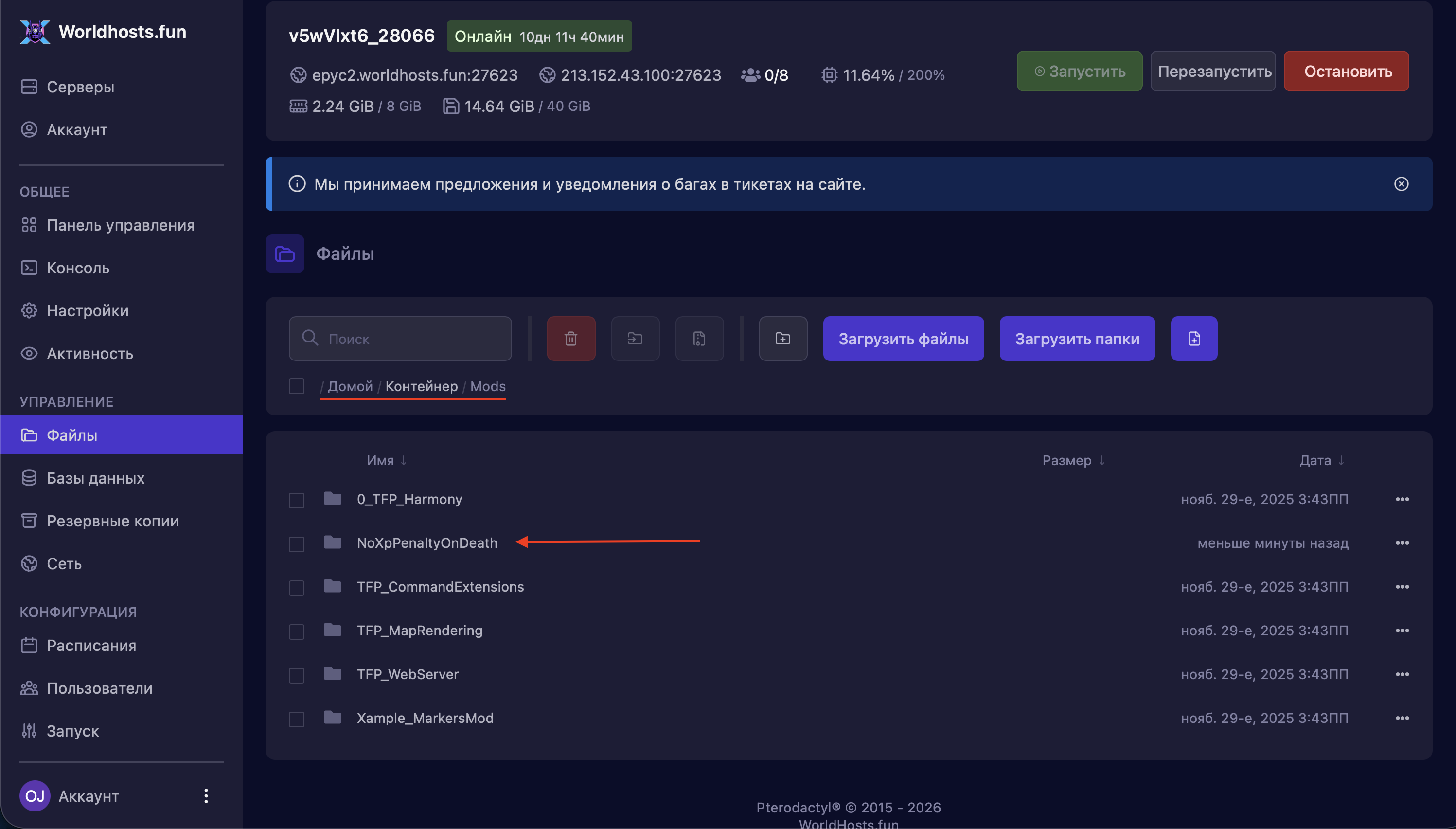 Шаг 1. Открываете панель управления, останавливаете сервер и переходите в раздел «Файлы».