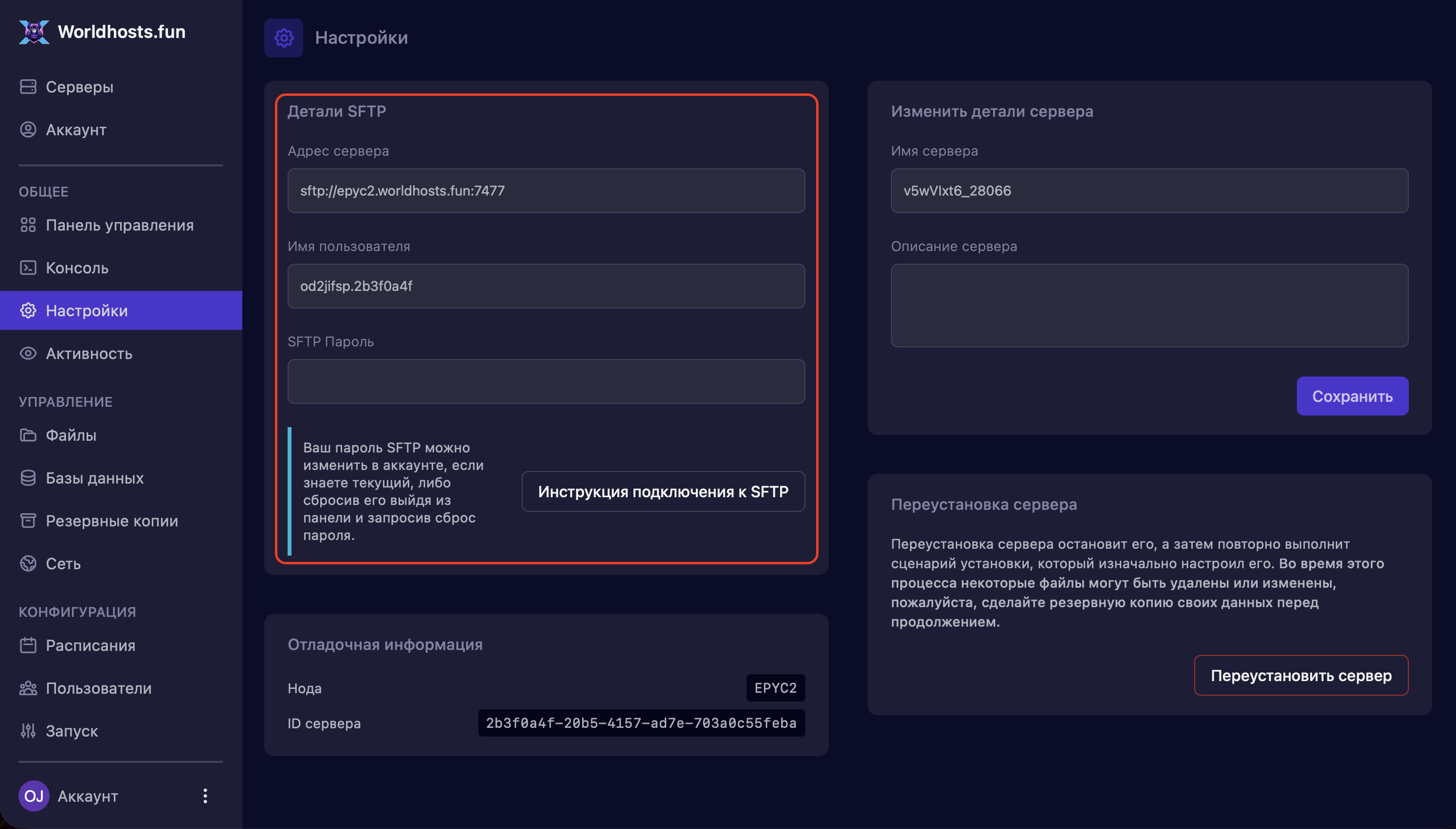 Шаг 2. Подключитесь к серверу через SFTP-клиент, например FileZilla, инструкция по подключению ТУТ. Доступы вы можете найти на странице настроек в панели управления.