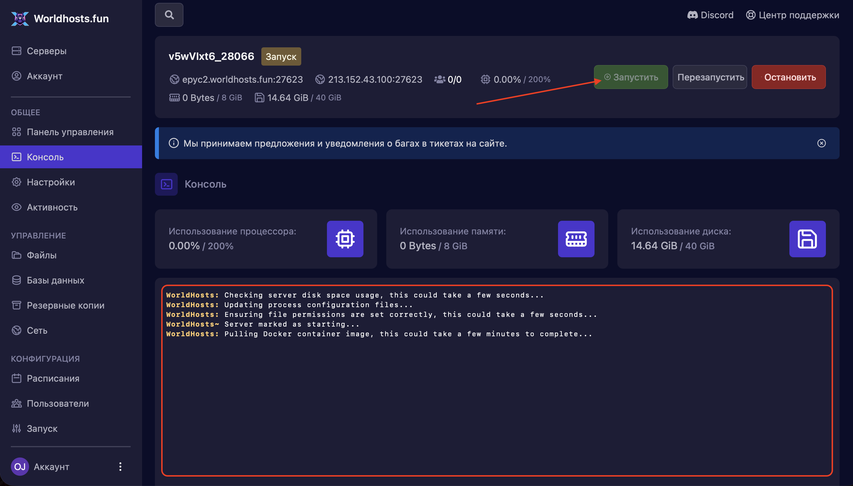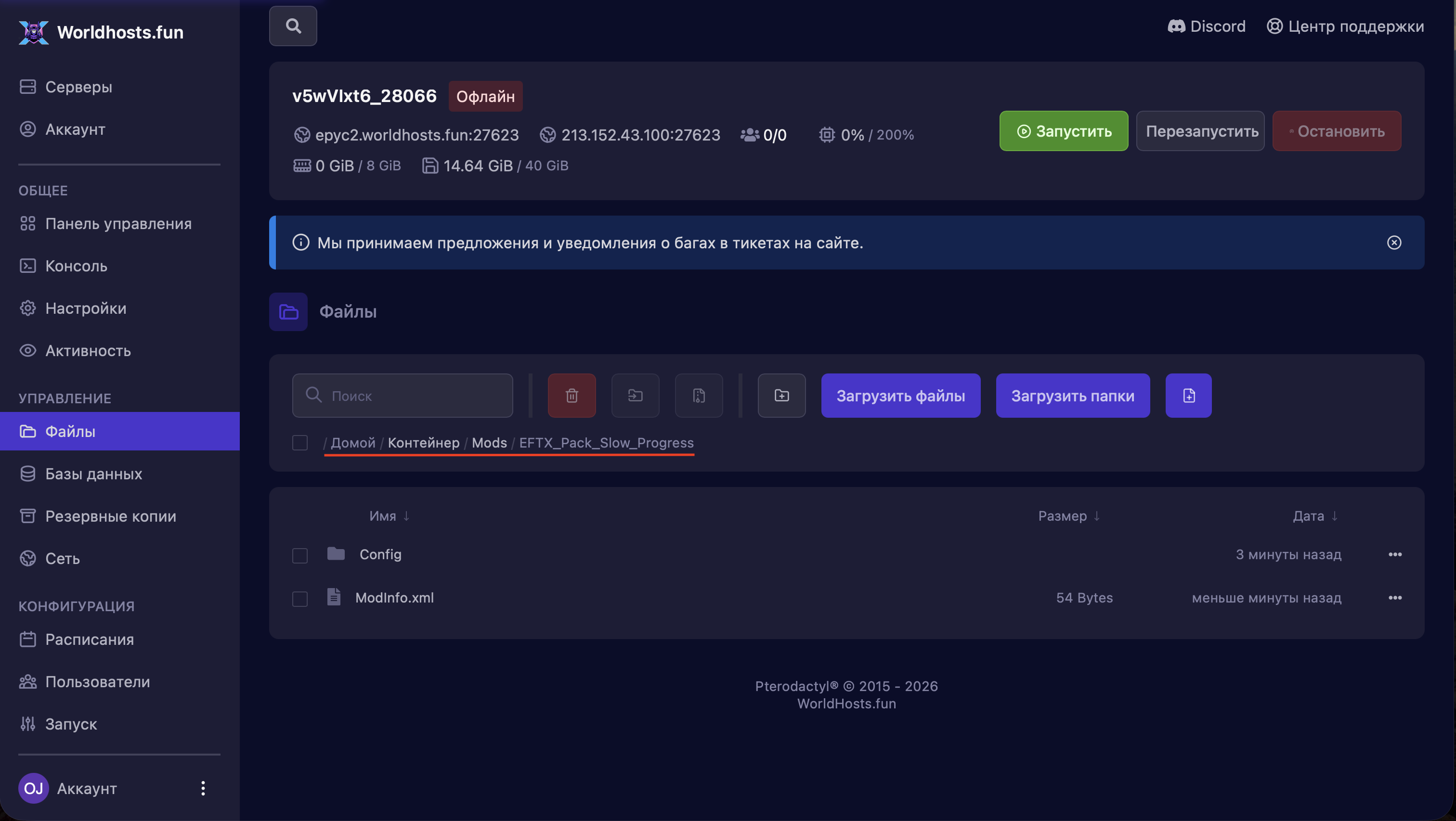- Никогда не загружайте и не удаляйте файлы модов на запущенном сервере. Всегда нажимайте кнопку «Остановить» или «Выключить» в панели управления перед началом работы.