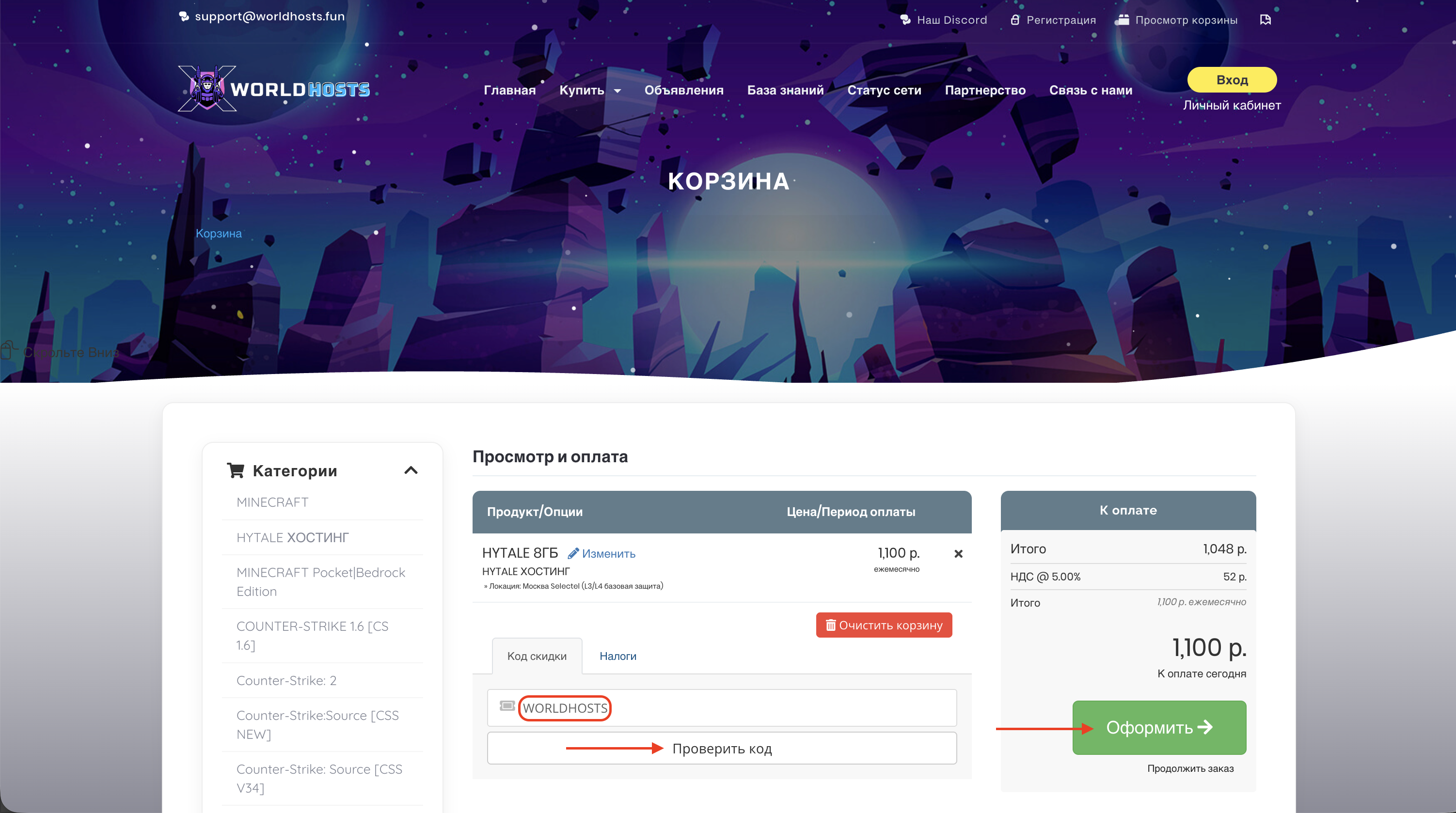Шаг 3. Чтобы получить дополнительные 15% скидки на первый заказ введите скидочный промо-код "WORLDHOSTS", затем нажимаете "Проверить код" и потом "Оформить".