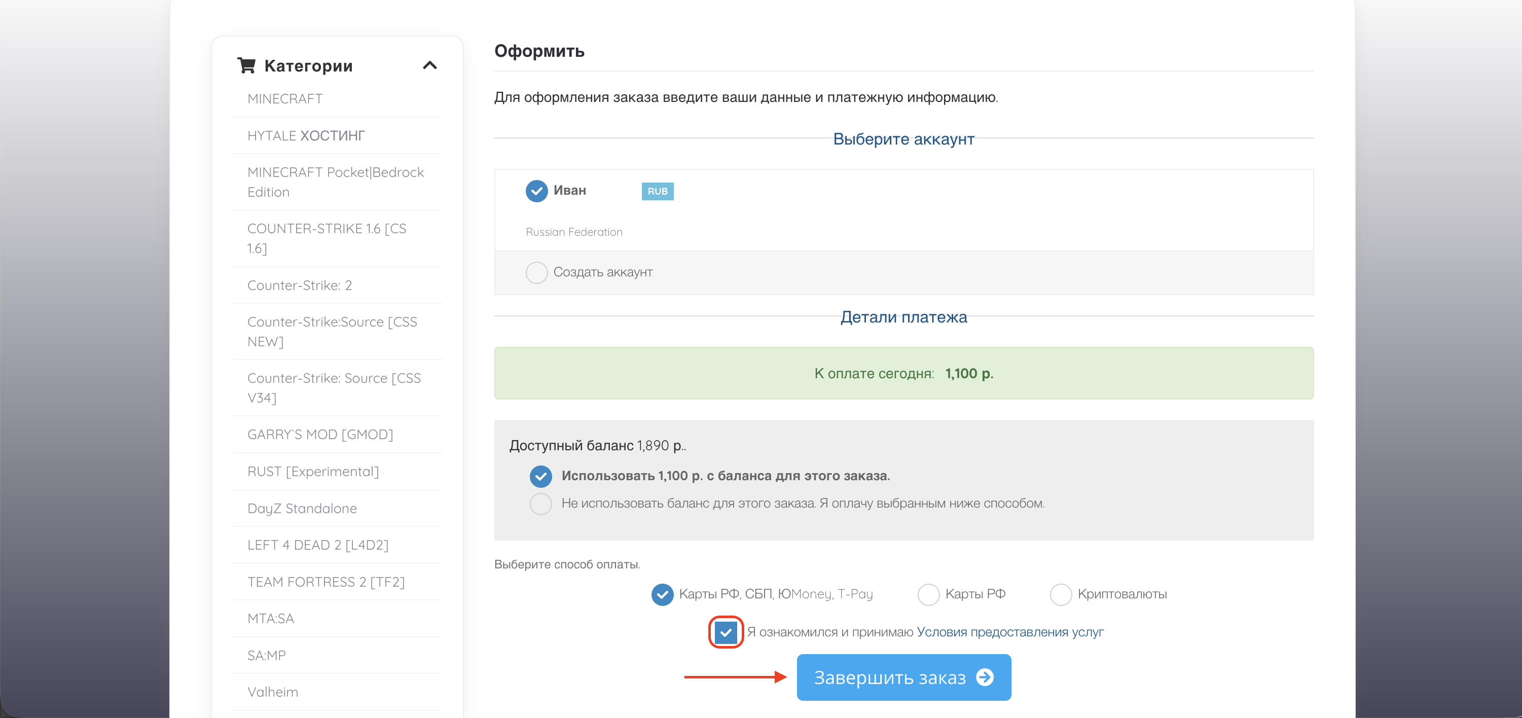 Шаг 5. Выбираем любой удобный способ оплаты, ознакомьтесь с «Условиями предоставления услуг» и нажимаете «Завершить заказ».