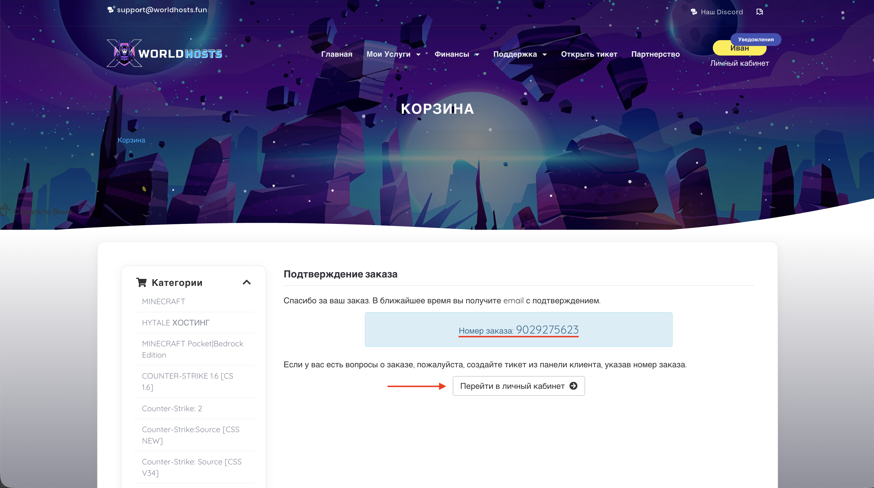 Шаг 6. Далее вы увидите номер заказа. Для настройки сервера перейдите в личный кабинет, выберете услугу и перейдите в панель управления сервером.