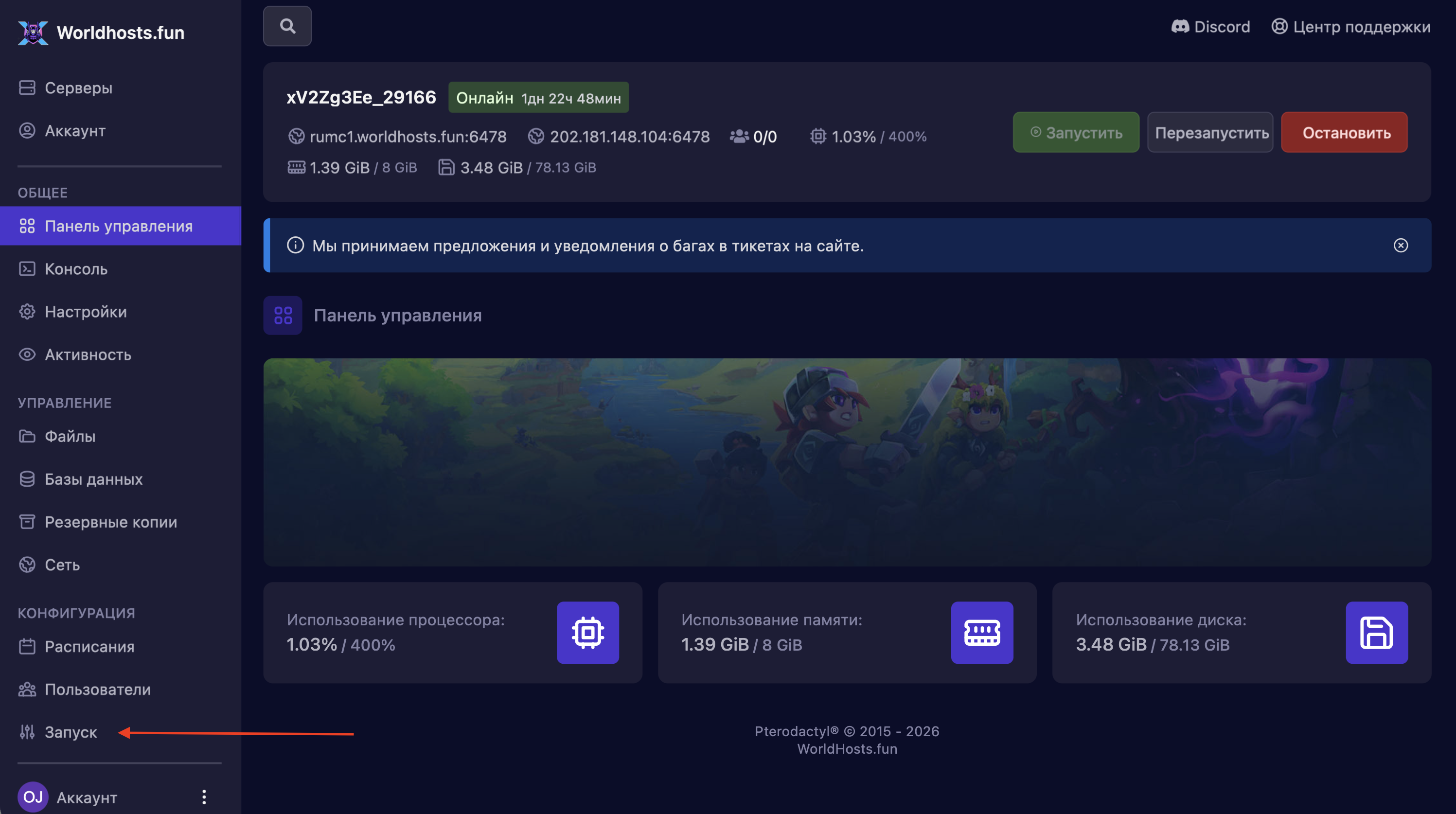 Шаг 1. Переходим в панель управления сервером и открываем страницу запуска.