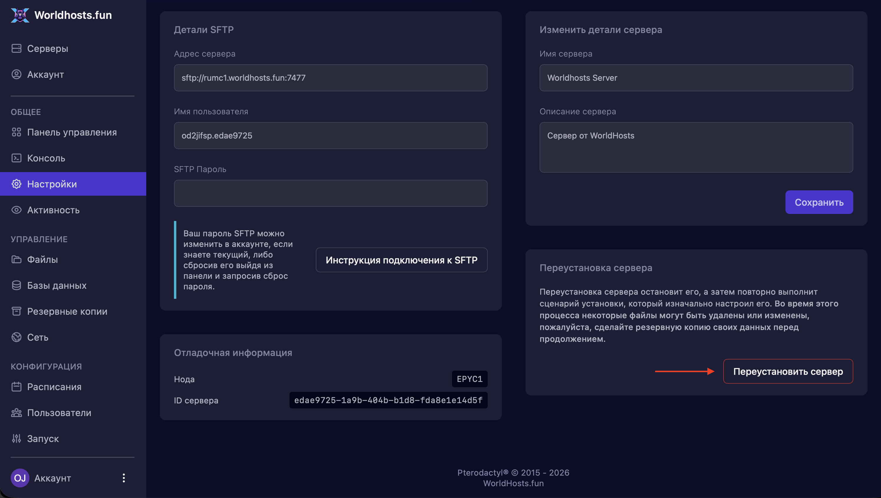 Шаг 2. Пролистав страницу ниже, вы найдете кнопку «Переустановить сервер». Переустановка запустит процедуру обновления версии сервера до самой актуальной.