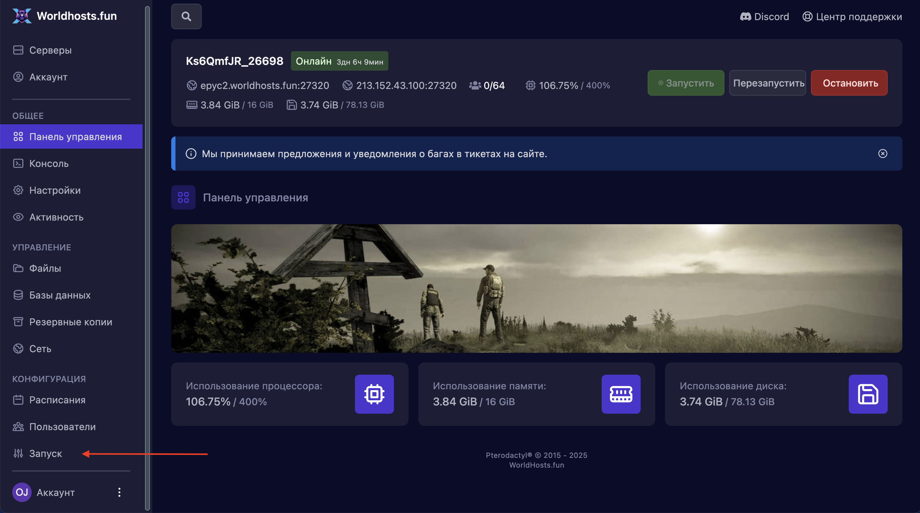 Шаг 1. Войдите в свой аккаунт на хостинге, откройте управление Вашим DayZ сервером и в боковом меню выберете «Запуск».
