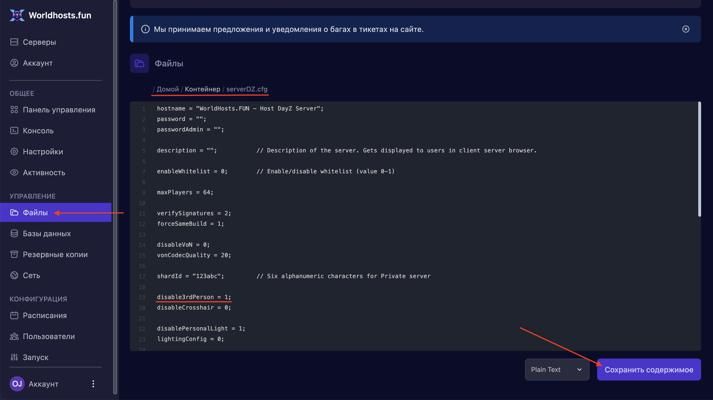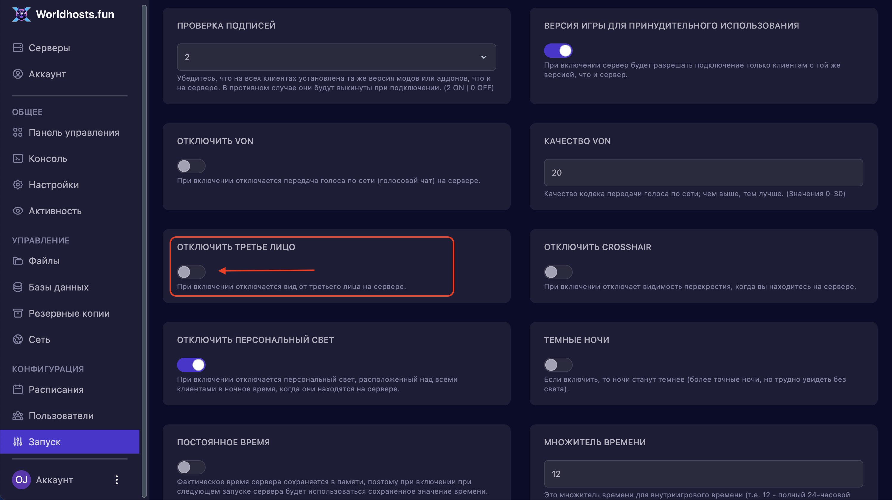 ☝️ Отключение вида от третьего лица — это простой и эффективный способ кардинально изменить атмосферу на вашем сервере DayZ Standalone, сделав его более хардкорным и атмосферным. Благодаря панели управления WorldHosts.fun вы в один клик сможете его отключить.