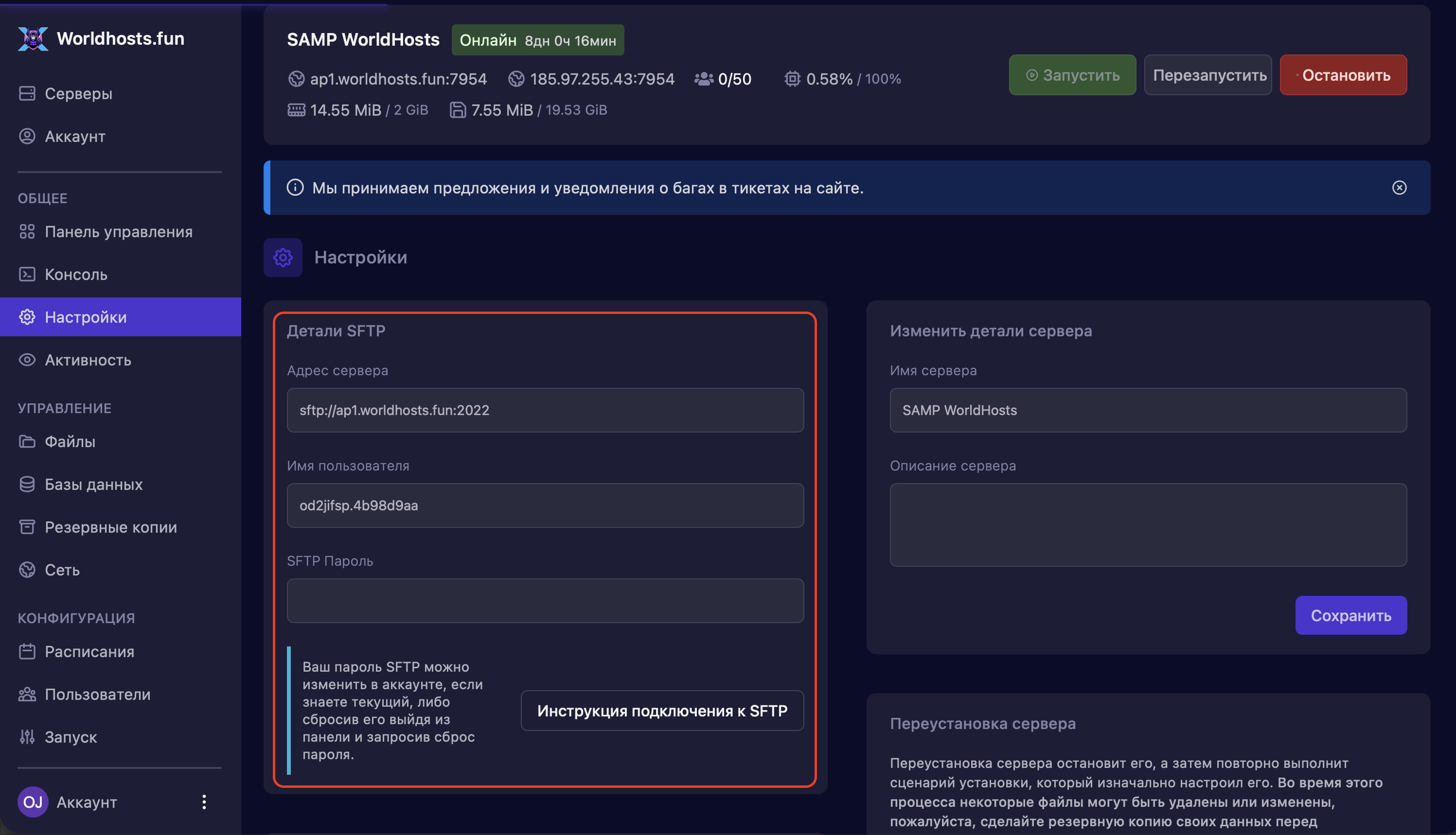 o Запомните данные от доступов к серверу (IP-адрес, логин, пароль для SFTP и базы данных), найти их можно в настройках панели управления сервером.