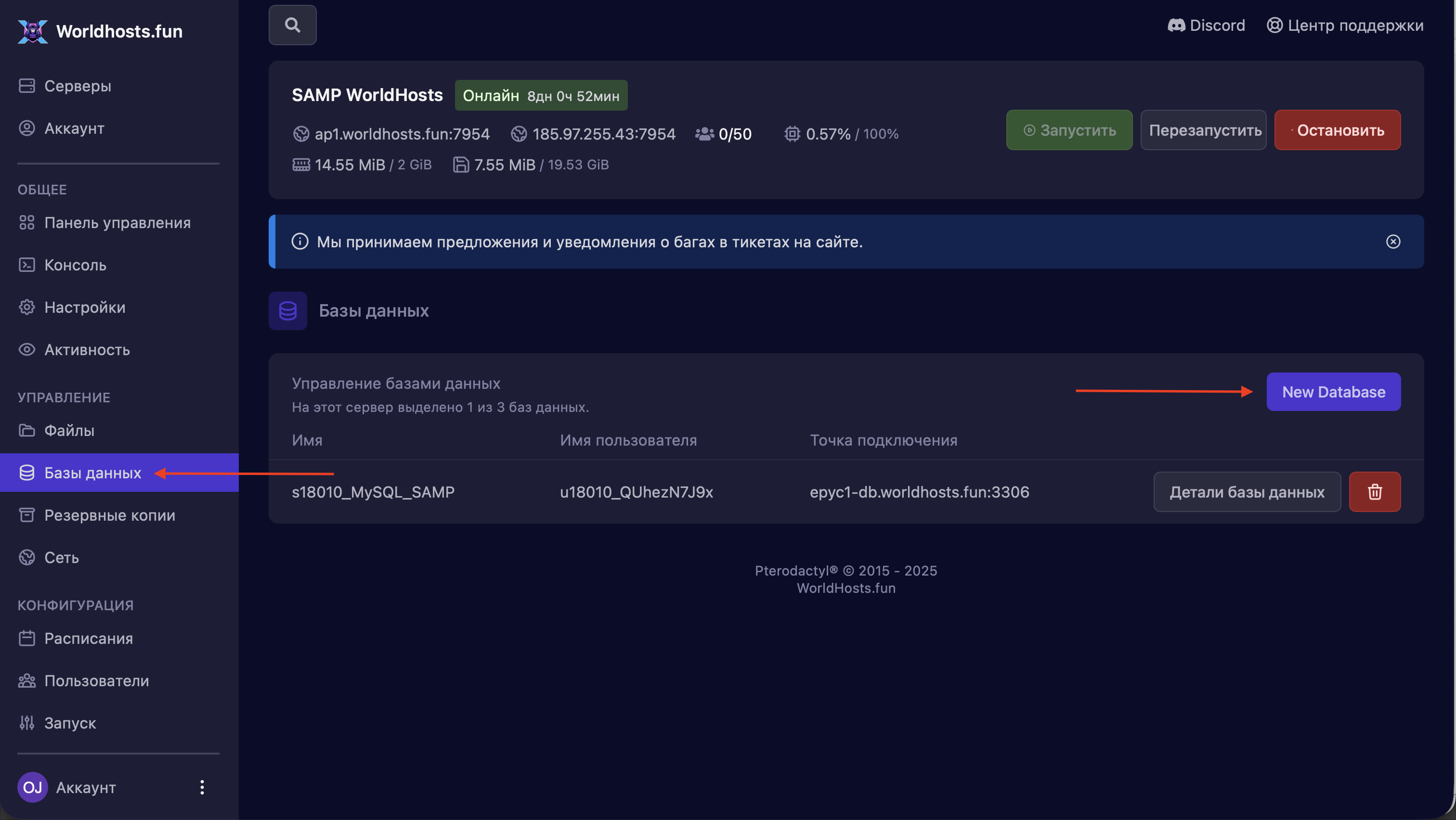 - Создайте новую базу данных в панели управления WorldHosts.fun