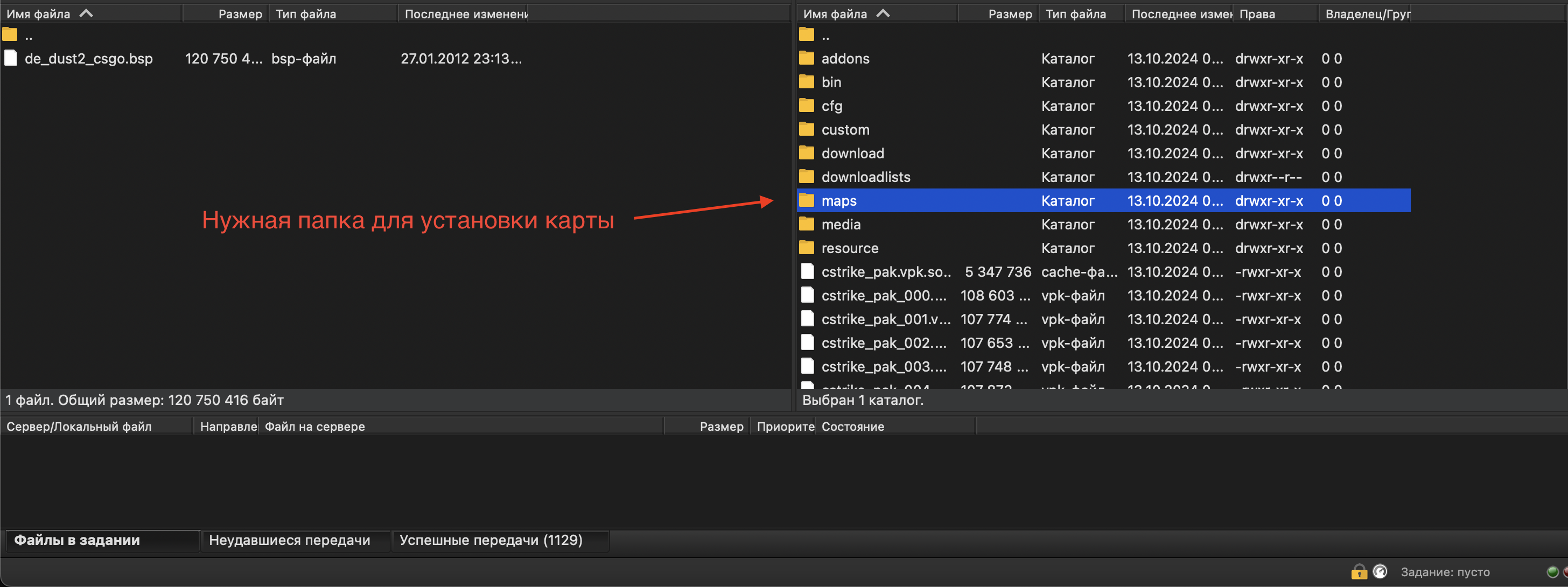 Шаг 2. Распаковываем скаченный архив, копируем файлы в аналогичные папки, например папку «maps» копируем в такую же папку «maps» на сервере, действуем также с остальными папками. Возможен вариант, что в архиве будет только файл с форматом .bsp – это сама карта. Она должна быть в папке «maps».