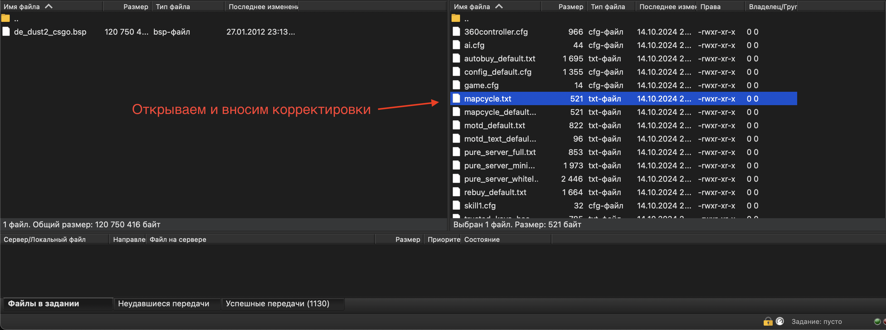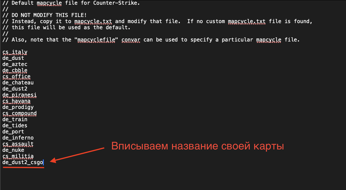 А вот в файле mapcycle.txt дописываем строку с названием нашей карты, в моем случае это: de_dust2_csgo.bsp.