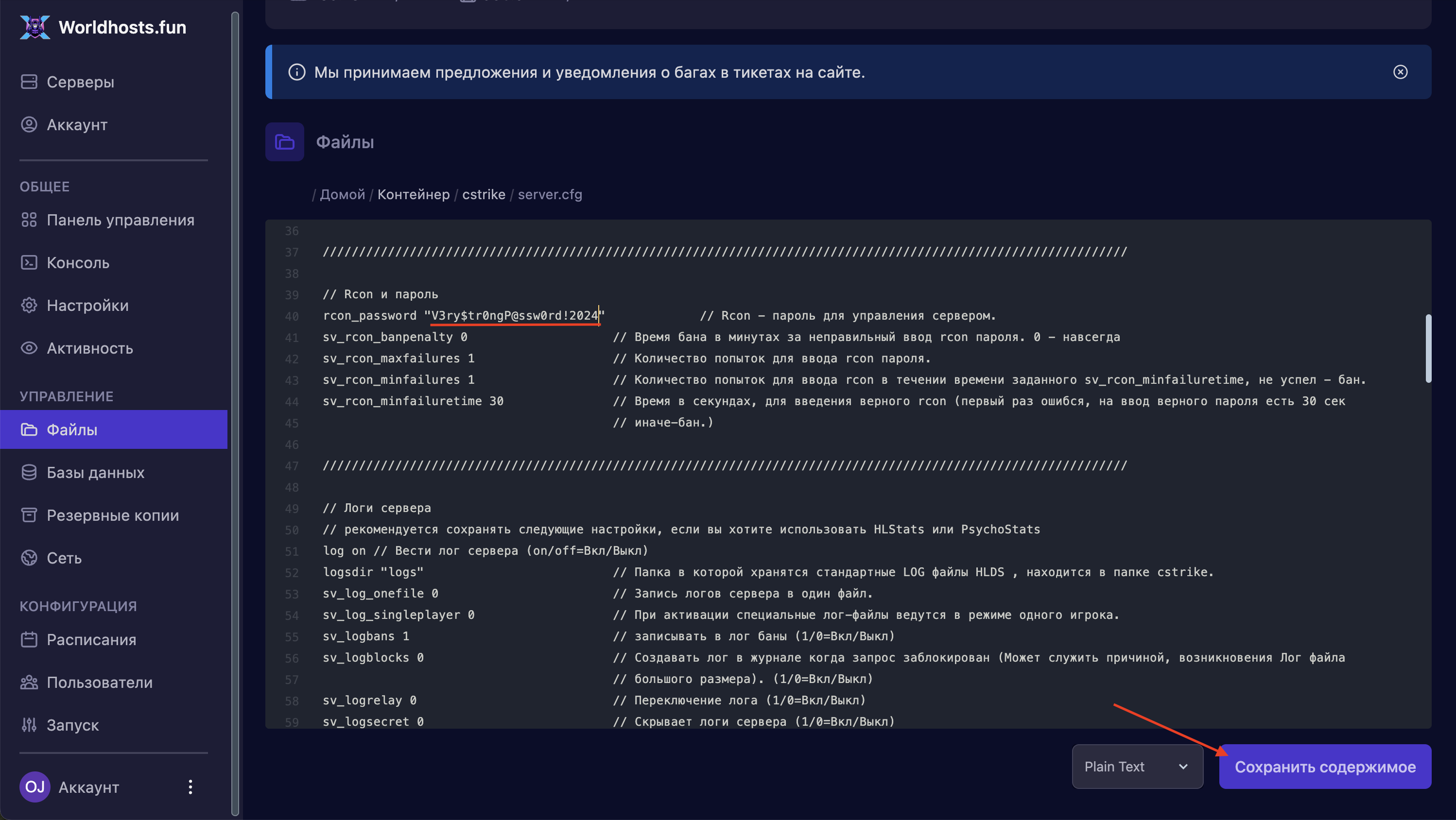 - В файле server.cfg вашего сервера установите сложный пароль: