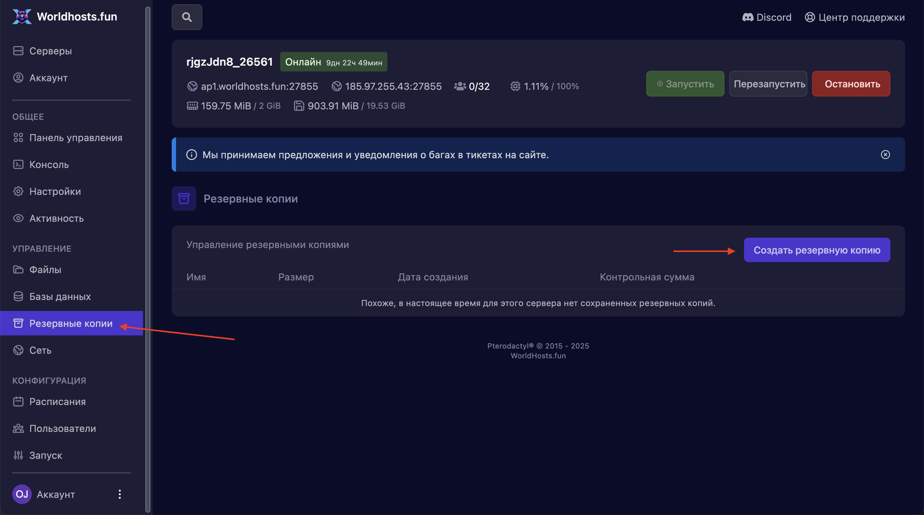 - В панели управления WorldHosts.fun выберите в боковом меню «Резервные копии».